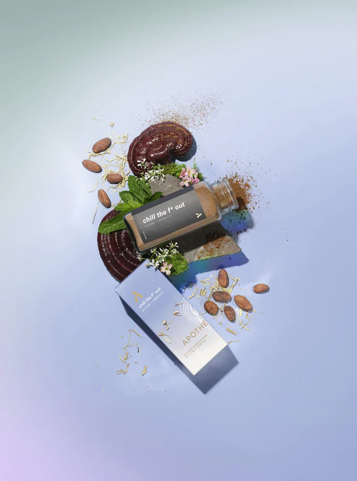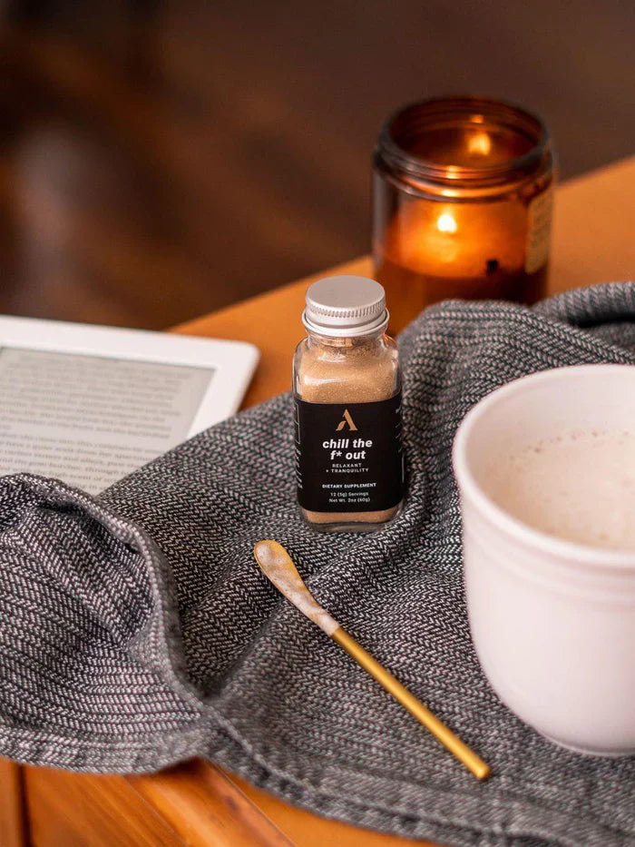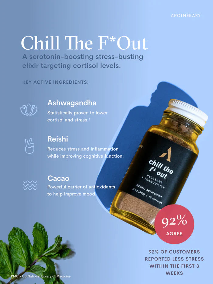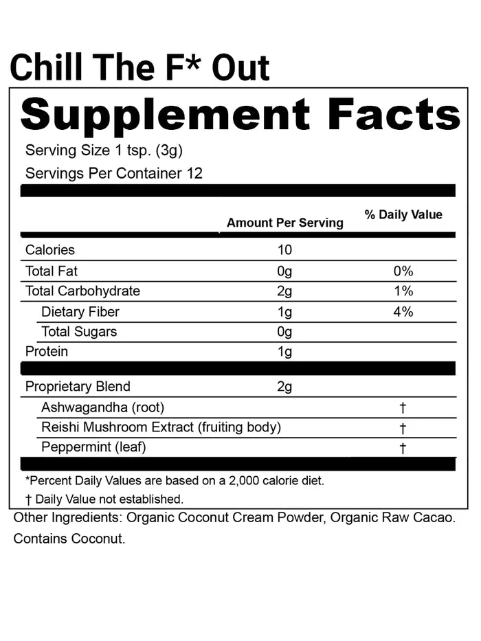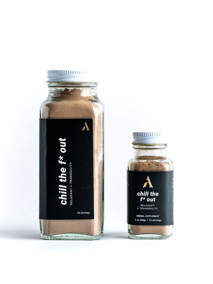 Chill The F* Out gives us peppermint chocolate tea vibes when combined with water. Or mix with a nut milk and a sweetener for peppermint cocoa.