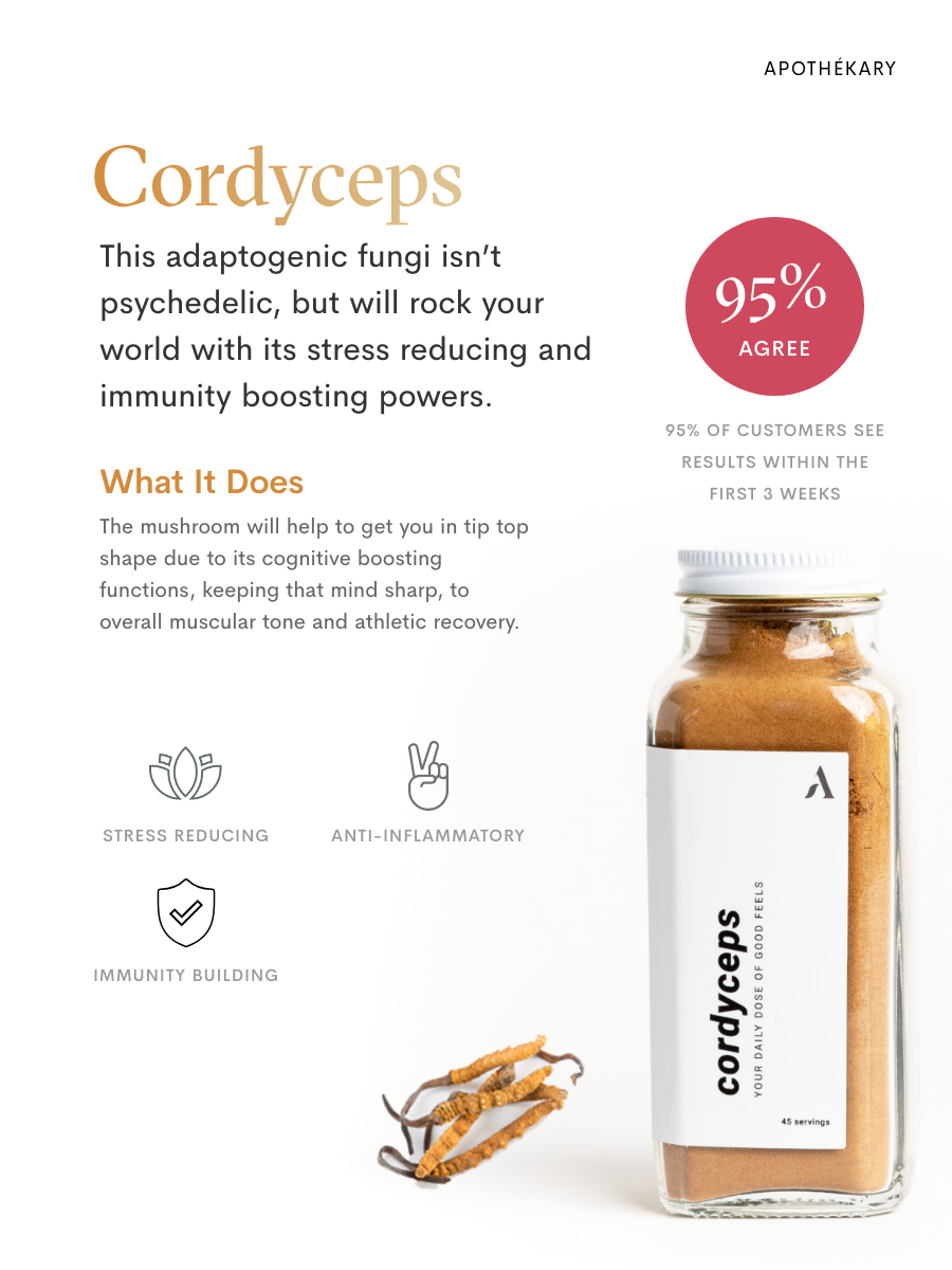 Originally found in the high mountains of the Himalayas, cordyceps is a non-psychedelic mushroom with properties to manage stress and increase energy levels. In the wild, cordyceps are quite rare and were historically reserved for royalty. This sustainably grown cordyceps will help you stay in top form with its cognitive benefits, keeping your mind sharp and your muscles even sharper.